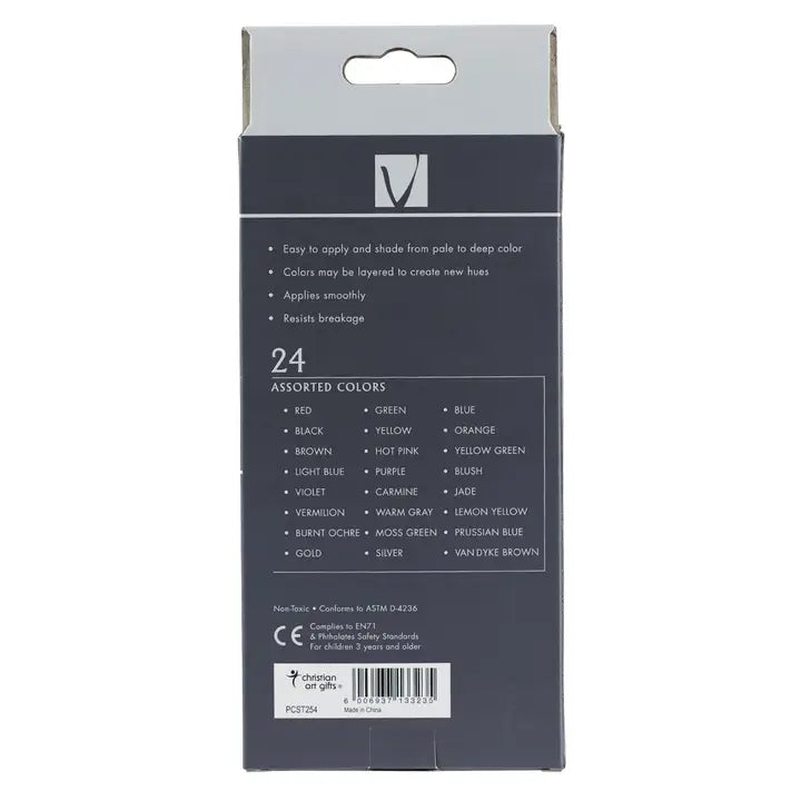 Unleash your creativity with a set of Veritas Colored Pencils.The large set holds 24 Colors. Front Row Left to Right: Hot Pink 212C; Purple 2685C; Blue 287C; Light Blue 299C; Green 348C; Yellow Green 376C; Yellow 102C; Blush 1555C; Orange 151C; Red 200C; Brown 478C; Black 4C; Back Row Left to Right:White 501; Burnt Ochre 153C; Magenta 2425C; Violet 2587C;Ultramarine 2746C; Jade 339C; Chrome Yellow 124C;Vermillion 172C; Carmine 191C; Brick Red 704C; Vandyke Brown 411C; Warm Gray 11C Use these colors by themselves for beautifully deep coverage.